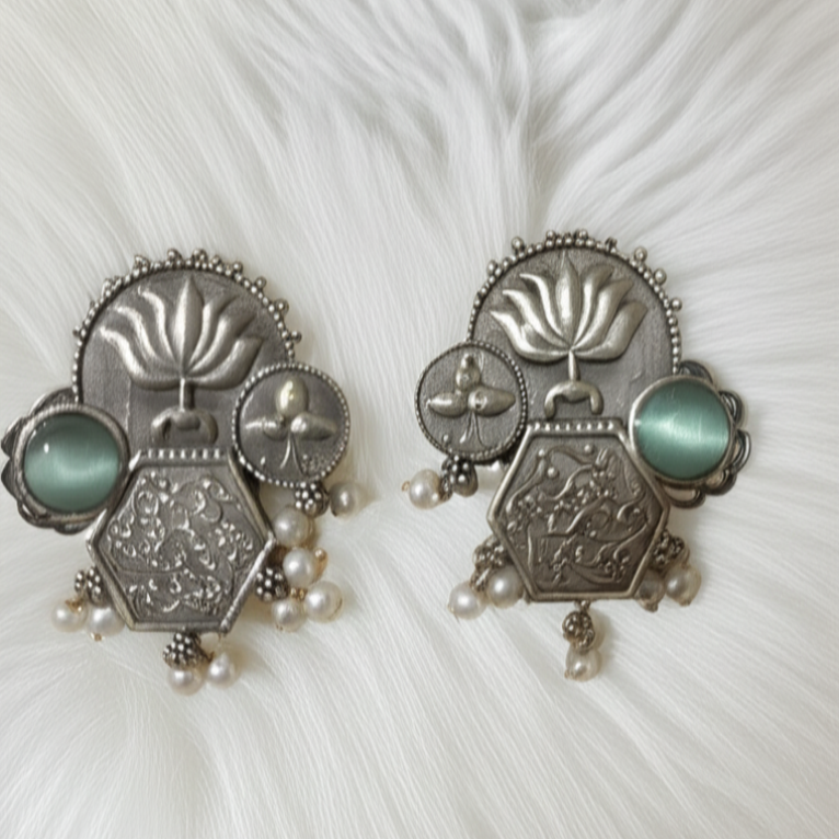 Rooted in tradition yet refreshingly unique, Arnika Bloom earrings blend antique charm with contemporary elegance. Crafted in oxidized silver, this pair features a bold raised lotus motif, symbolic floral engravings, hexagonal coin-inspired elements, and soft sea-green cabochon stones. Dangling faux pearls lend a rhythmic grace, making them the perfect choice for ethnic ensembles or Indo-fusion styles.