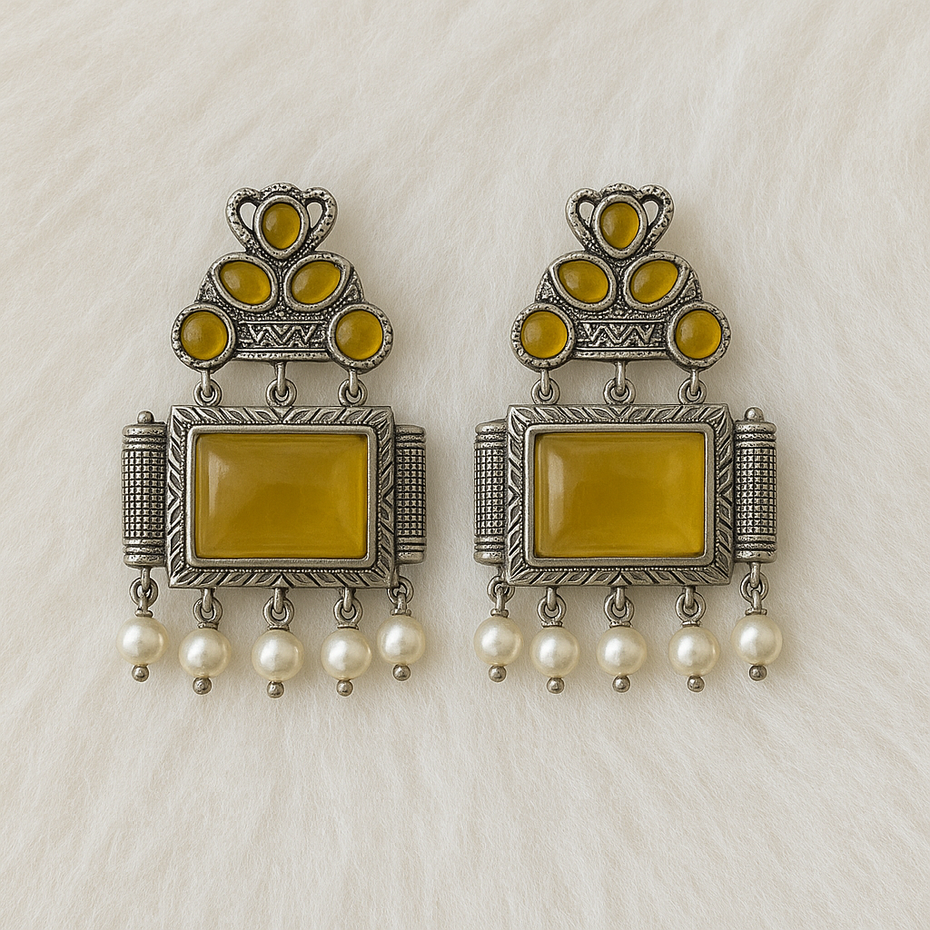 Bold, regal, and rooted in tradition, Royal Grace earrings are a celebration of heritage with a touch of contemporary elegance. Featuring a striking rectangular stone at the center, framed in oxidized silver with intricate detailing, the design is crowned with rounded toned accents. A row of classic pearl danglers adds a graceful finishing touch, perfect for elevating festive and ethnic ensembles.