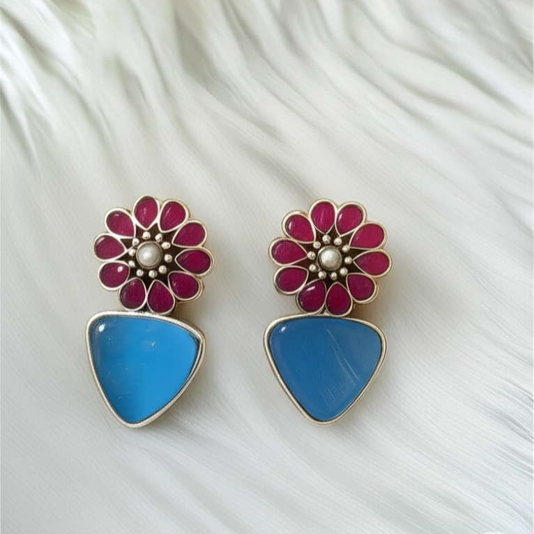 Bright, cheerful, and effortlessly chic, Iris Bloom earrings are a joyful ode to color and design. A cluster of deep magenta petals surrounds a dainty pearl center, forming a striking dark pink floral stud, while a glossy blue triangular stone dangles below in perfect contrast. Framed in brass, this playful yet elegant pair adds a fresh pop to both festive and casual looks.