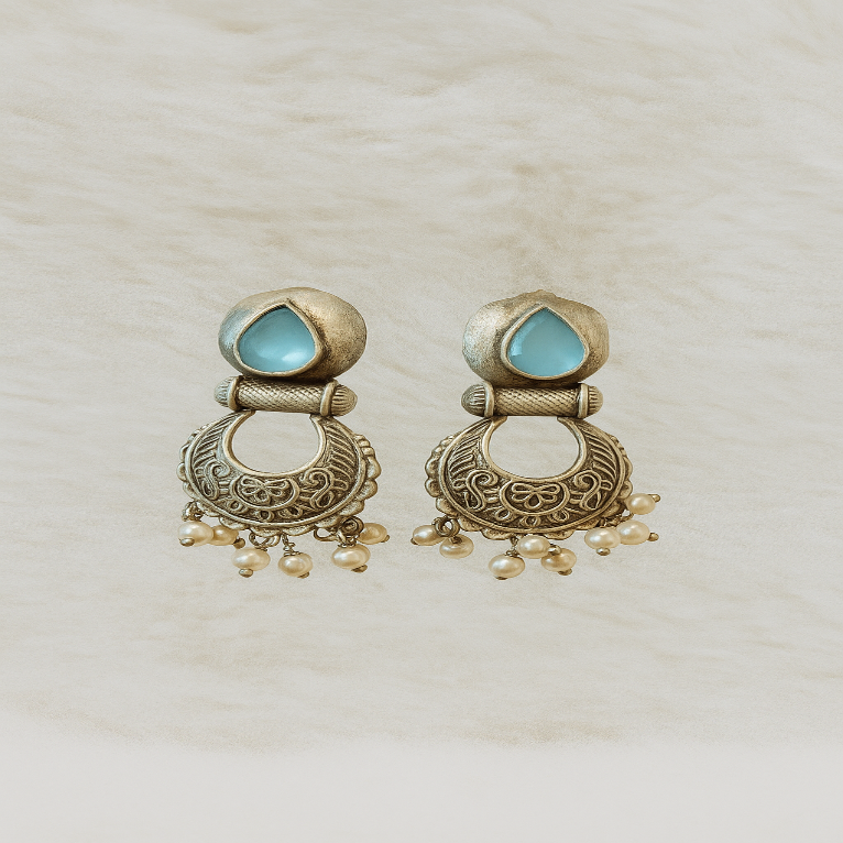 An ode to moonlit nights, Moonlit Azure earrings fuse chandbaali curves with the depth of blue stones. Delicate pearls frame the oxidized silver design, while the structured silhouette channels elegance through contrasting textures and celestial inspiration.